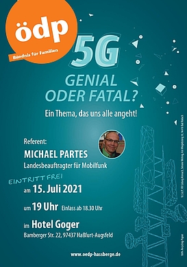 Der Kreisverband der Ökologisch-Demokratischen Partei (ÖDP) lädt ein zu einem Vortrag zum Thema „5G – genial oder fatal?“ am Donnerstag, 15.07.2021 um 19.00 Uhr im Hotel Goger, Bamberger Str. 22, 97437 Haßfurt – Augsfeld.